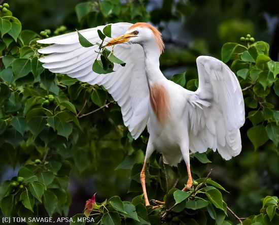 "YOUNG CATTLE EGRET WITH LEAVES"