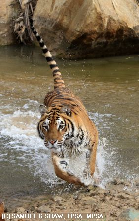 "SIBERIAN TIGER CHARGING THRU WATER"